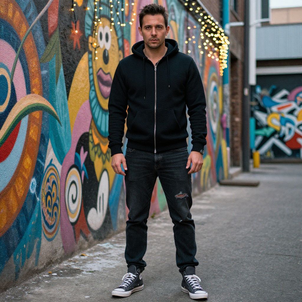 A man, sporty urban look, black zip-up hoodie, dark wash distressed jeans, charcoal high-top sneakers, relaxed fit, vibrant mural-covered alley, twinkling fairy lights, eclectic street art, ektachrome film stock, confident expression. Man has masculine face and piercing eyes