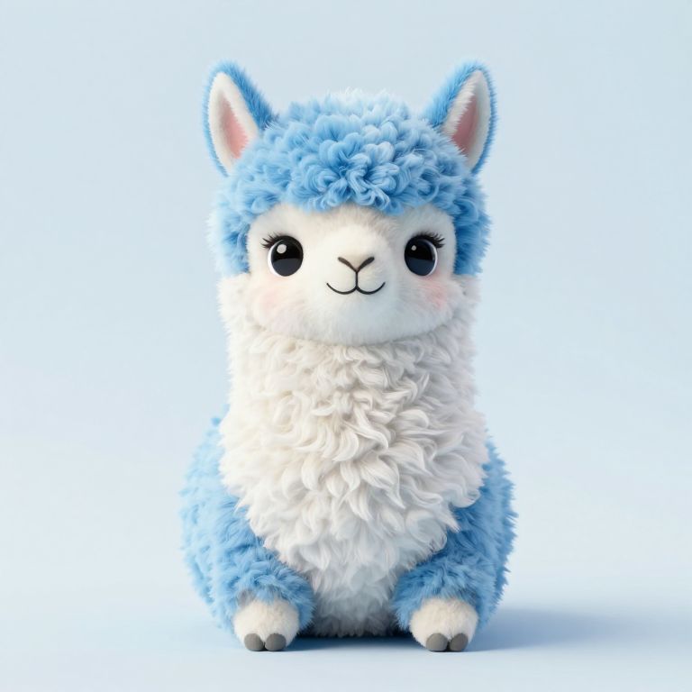 The image features a charming, plush stuffed animal resembling a lama, with a soft, fluffy texture that gives it a cuddly appearance. The lama is predominantly blue and white, with a light blue mane and a white body. Its face is expressive, with large, black, round eyes and a small, curved nose, giving it a friendly and endearing look. The lama is sitting upright, with its legs tucked underneath its body, and its arms resting on its sides. The background is a simple, solid blueish-white color, which contrasts with the lama's vibrant colors and highlights its features. The overall composition is balanced, with the lama centered in the frame, creating a sense of harmony and focus. The image exudes a sense of warmth and comfort, making it visually appealing and inviting.