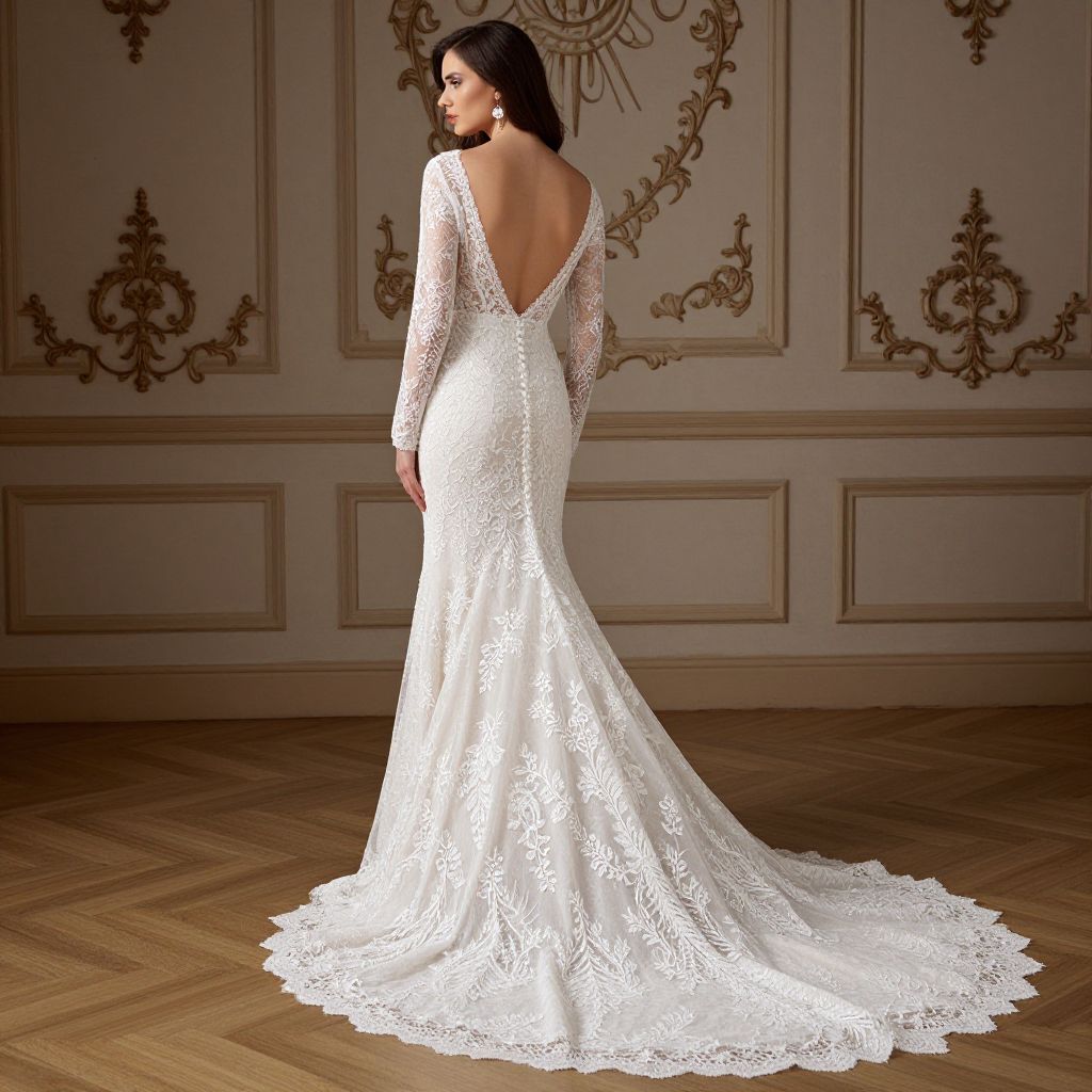 Elegant lace-sleeve wedding dress elegantly draped on a woman's back, showcasing intricate detailing and a flowing train against a classic, ornate interior backdrop.