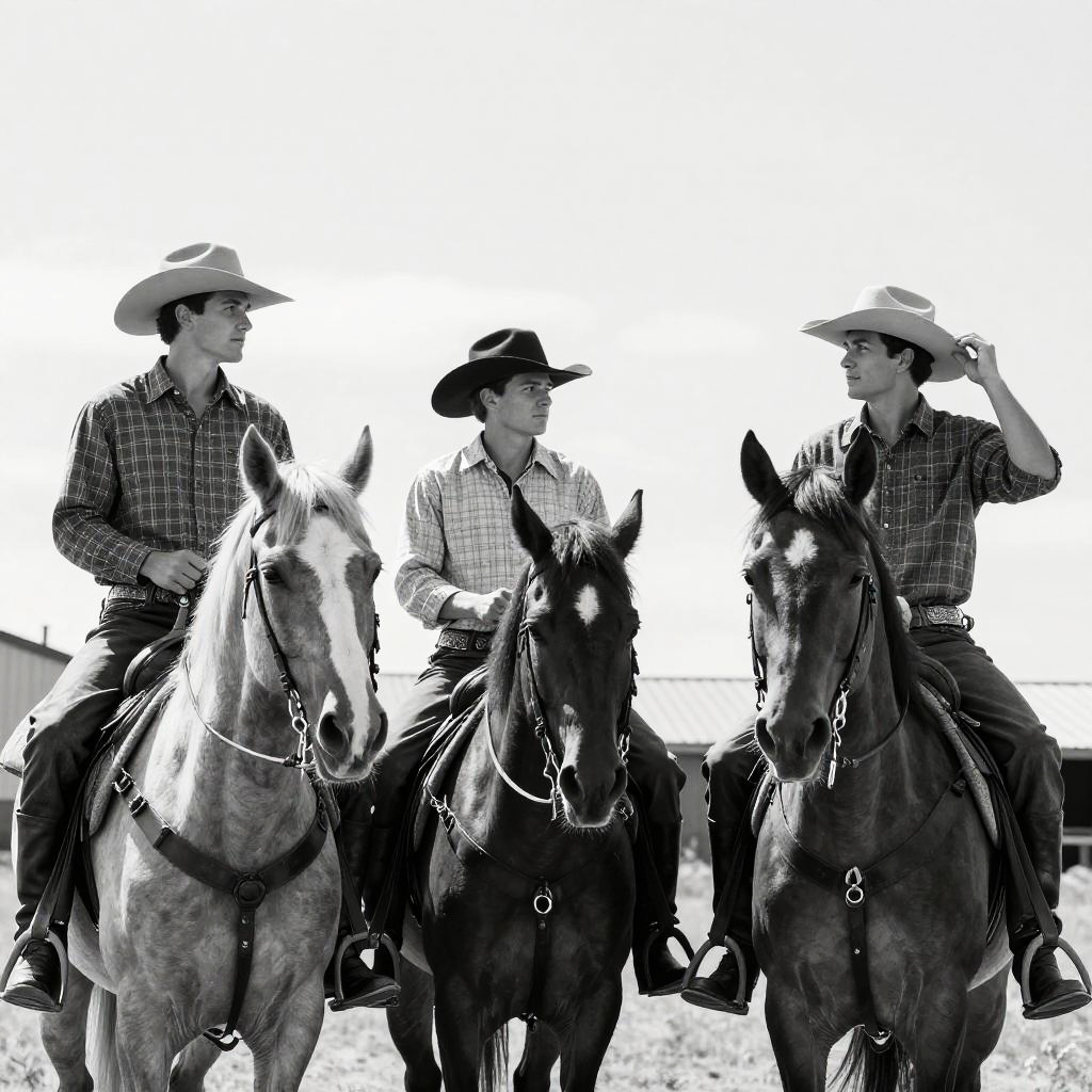Black and white photograph of four cowboys on horseback. Two cowboys on the left and right are standing tall on their horses, wearing wide-brimmed hats and western attire, looking towards each other. One central cowboy with a smaller hat is slightly crouched, while the fourth cowboy on the far right adjusts his hat. The background is a bright, overexposed sky with indistinct buildings. The horses' manes and tails are prominent.