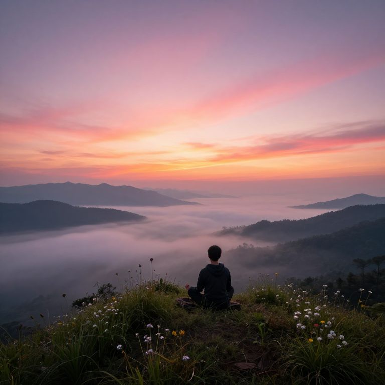 Unwind on a mountaintop at dawn, panoramic view of mist-covered valleys below, vibrant sky with hues of pink and orange, a lone figure sitting cross-legged in meditation, surrounded by wildflowers, crisp air, highly detailed, atmospheric.