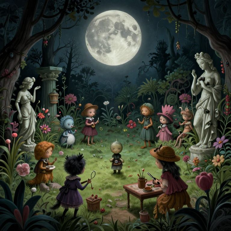 Craft an enchanting digital artwork that embodies the whimsical yet eerie essence of Edward Gorey's haunting illustrations. Depict a surreal moonlit garden scene, viewed through a unique cyclops-like perspective, teeming with peculiar anthropomorphic creatures engaged in cryptic activities among overgrown flora and crumbling statues. This juxtaposition of innocence and mystery will evoke intrigue, drawing viewers into an imaginative world where reality and fantasy entwine, inviting them to explore the secrets concealed within its shadowy depths.
