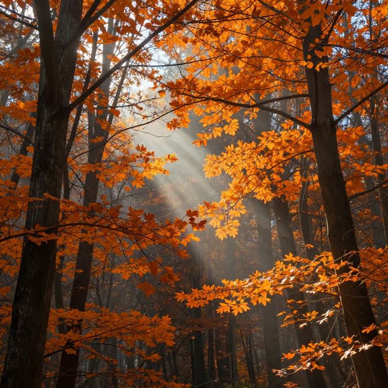 Arancioni forest in autumn, dense trees with bright orange leaves, rays of sunlight piercing through the canopy, misty background adding depth, rich textures and warm tones, highly detailed nature scene with crisp realism.