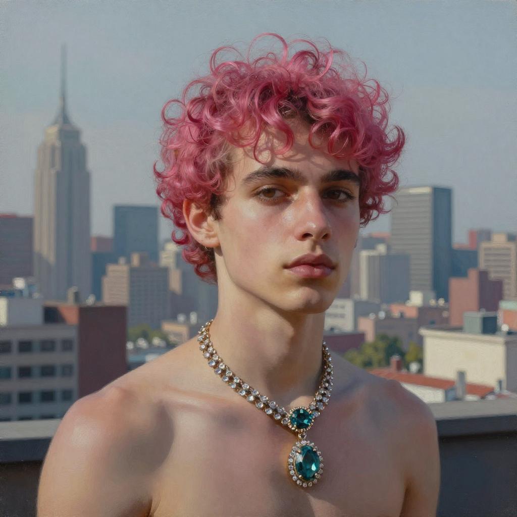 A painting of a city skyline, inkpunkHeavy768, f/1.4, square image, close up film photo, portrait of a Teenage Boy, magenta curly, dark brown eyes, high fashion jewelry, elegant pose, atmospheric lighting, cinematic composition, detailed, summer, filmgenre__