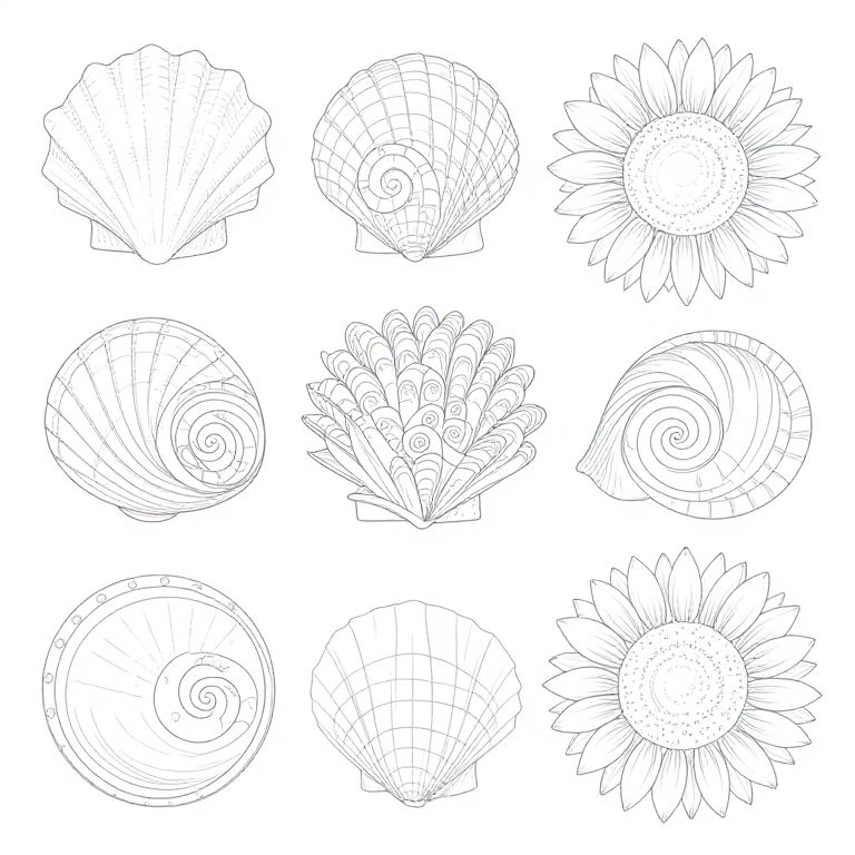 Black-and-white line drawing of nine seashells and sunflowers, arranged in a 3x3 grid, with detailed grid and spiral patterns.
