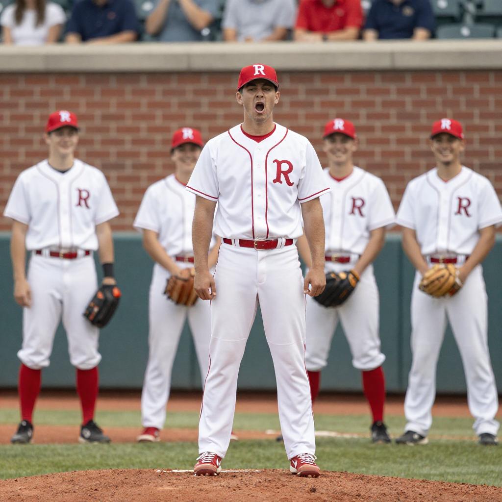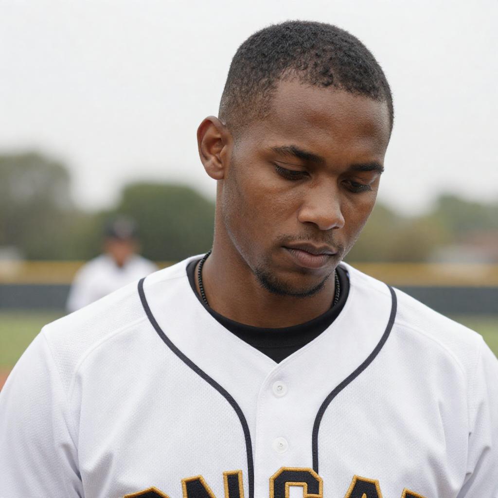 Photograph of a smiling young man with medium brown skin and dark hair, wearing a red baseball cap with a white "P" and a white pinstriped baseball uniform. He stands on a baseball field with a blurred background of green grass and a distant player in white.