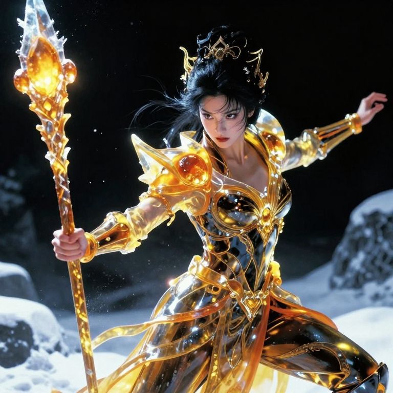 Cinematic style, illustration, dramatic chiaroscuro, ethereal beauty, Extreme Upper Body Closeup Portrait, Vibrant Amber and golden-black color graded, AmanoER, analog Photo of a wizard with a staff full of crystals, the crystals are round golden amber, hkevil ninja-goddess, action pose, featuring a stylized, a ninja with translucent Amber ice-based powers, He is depicted standing in a snowy, shadowy background, giving an action pose, Casting a spear Made of ICE and frost, The blue dark-orange-yellow outlines and defines the character's muscular physique, ornate suit of armor, The armor includes a translucent amber and black chest piece with intricate Design