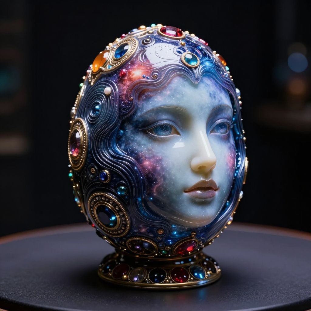 ((masterpiece, best quality, highres, realistic)) Perfect Face, intricately detailed murano glass Faberge egg with a galaxy pattern and beautiful helical carvings, and adorned with colorfull gemstones, On a table, dark sci-fi background, soft cinematic lighting, 8k, unreal engine, octane render, volumetric lighting, soft area lighting, volume scatteringCyberpunk Meca, unknown, mysterious, highly detailed, dynamic pose, 3/4 view, from a higher angle
