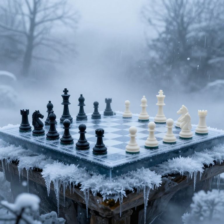 Photograph of a snow-covered chessboard with black and white pieces, set outdoors on a wooden pedestal surrounded by icicles. The chessboard is positioned in the center, with a misty, wintry forest background featuring bare trees. The black pieces are on the left, while the white pieces are on the right. The entire scene is bathed in a bluish, wintry light, enhancing the frosty atmosphere. Snowflakes are visible falling in the background, adding to the cold, serene ambiance.