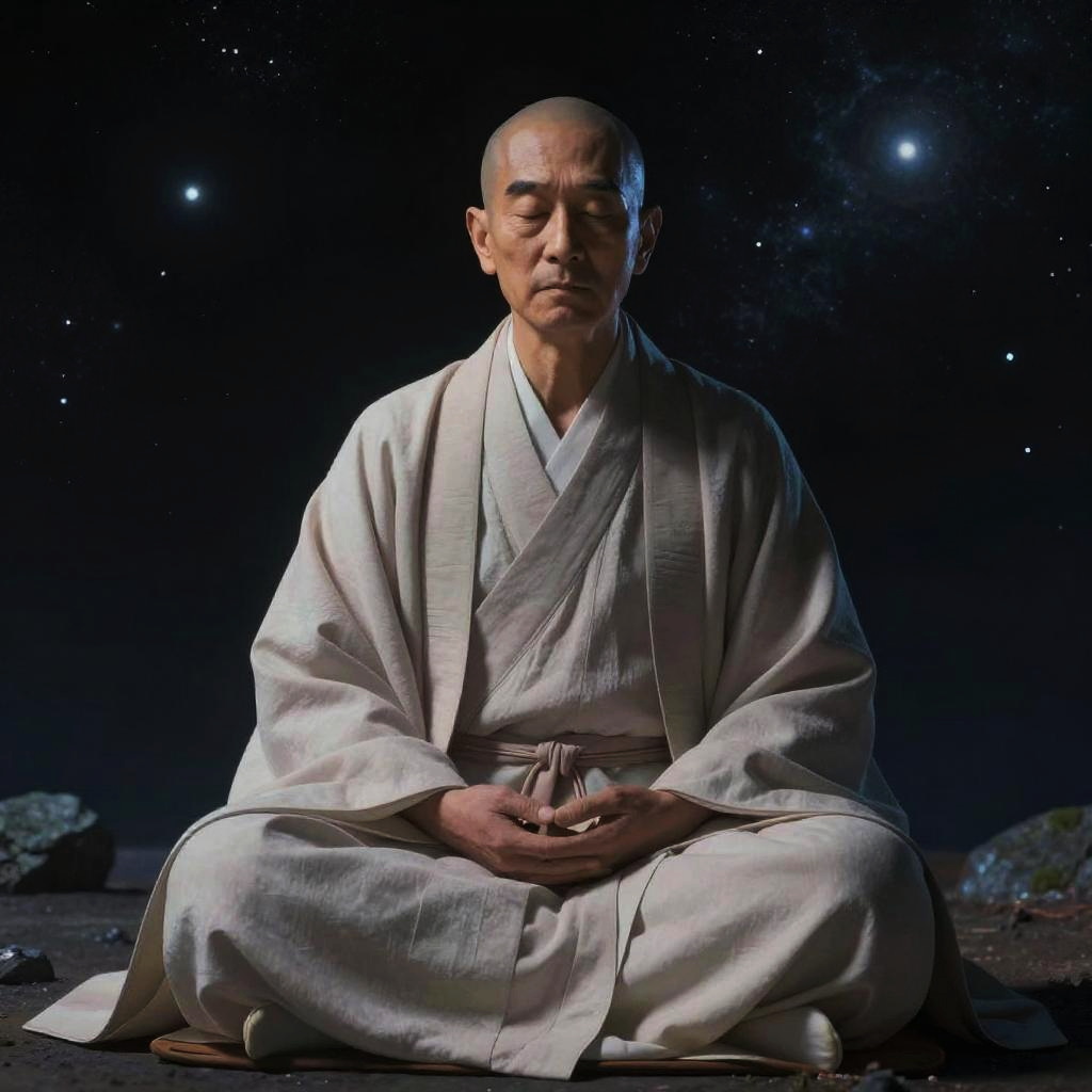 Photograph of an elderly Asian man with a shaved head, seated cross-legged on a dark, rocky surface under a starry night sky. He wears a traditional white kimono with wide sleeves and a tied belt, his hands resting in his lap. His eyes are closed, and his expression is calm and meditative. The background is black with visible stars, adding a serene, cosmic feel to the image. The lighting highlights his face and kimono, creating gentle shadows that enhance the texture of the fabric.