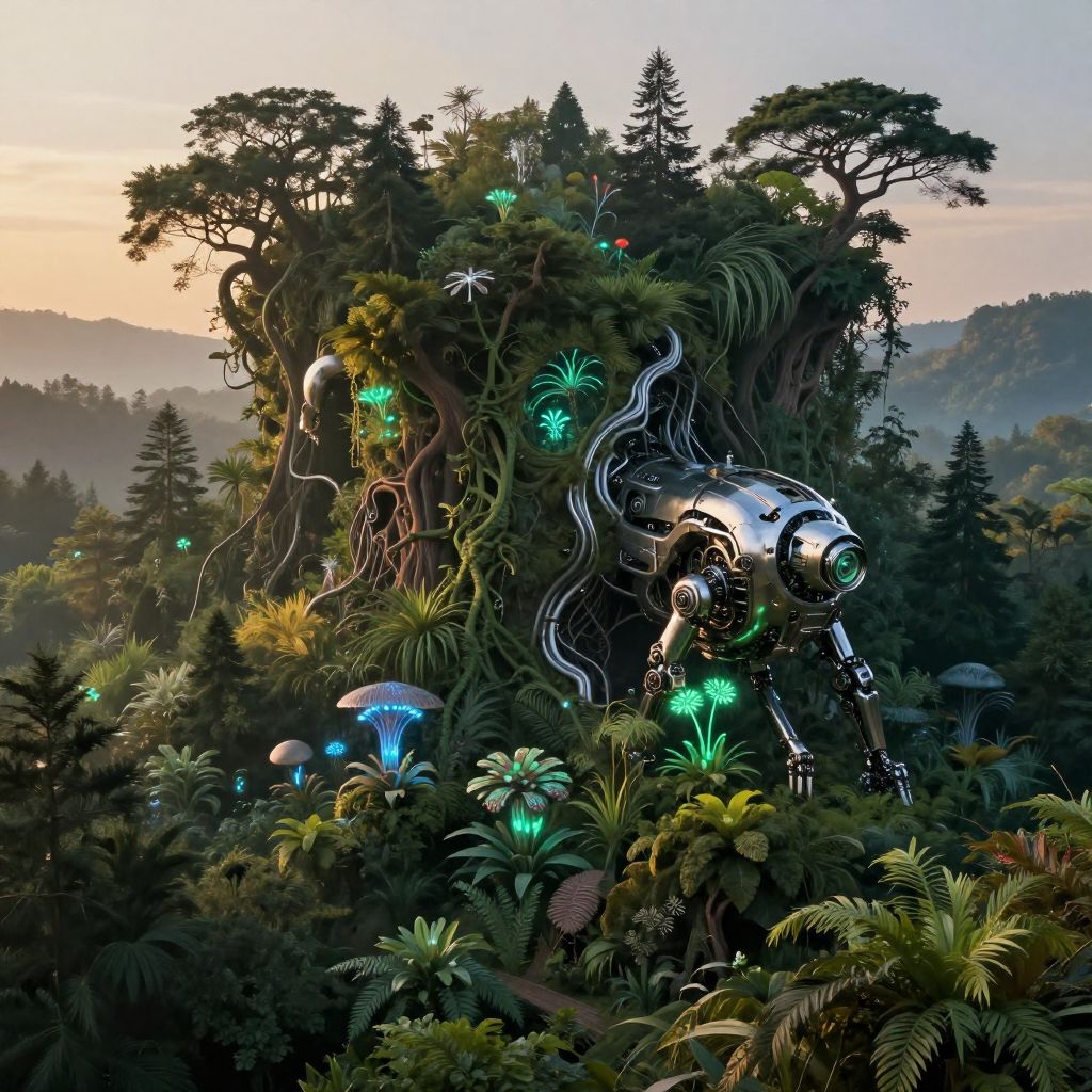 Midjourney themes visualized in an abstract fusion of nature and machinery, where lush forests merge with mechanical structures, bioluminescent plants illuminating a twilight scene, intricate details in metallic vines and robotic wildlife, ethereal mood with soft golden hour lighting.