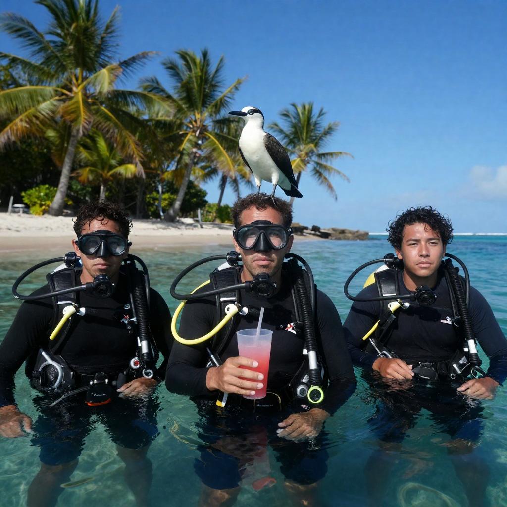 Photograph of a muscular man with short, dark hair, shirtless, holding a spear with a wooden handle. Blue underwater background with swimming fish and a snorkeler. Man's face shows intense focus, eyes slightly squinted. Man on right, snorkeler on left.