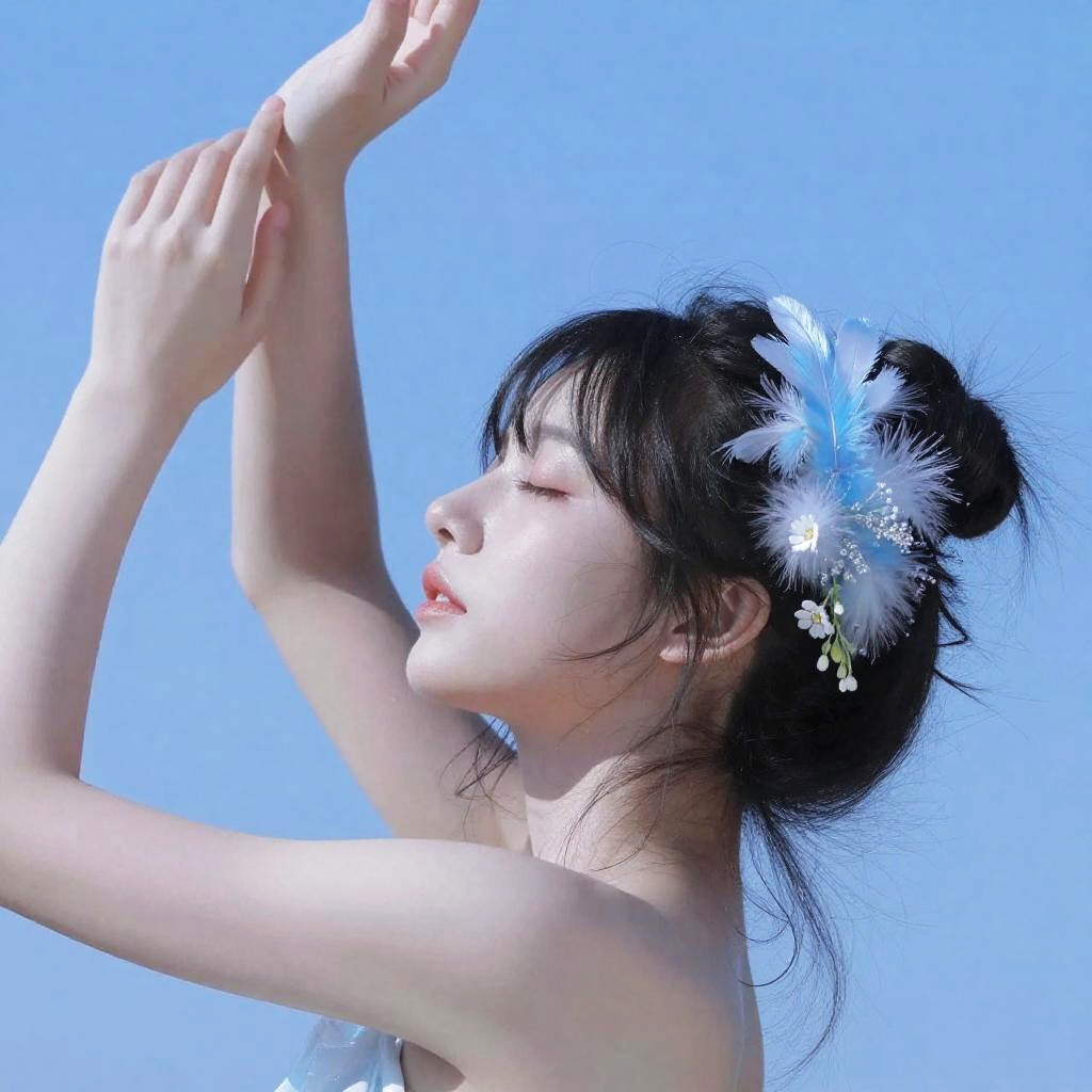 Photograph of a young woman with pale skin and dark hair, styled in a messy updo with blue feathers and small white flowers. She's shown in profile, facing left with her eyes closed and arms raised. The background is a solid, bright blue, creating a dreamy, ethereal vibe. Her bare shoulders suggest she might be topless. The image has a soft, almost surreal quality.