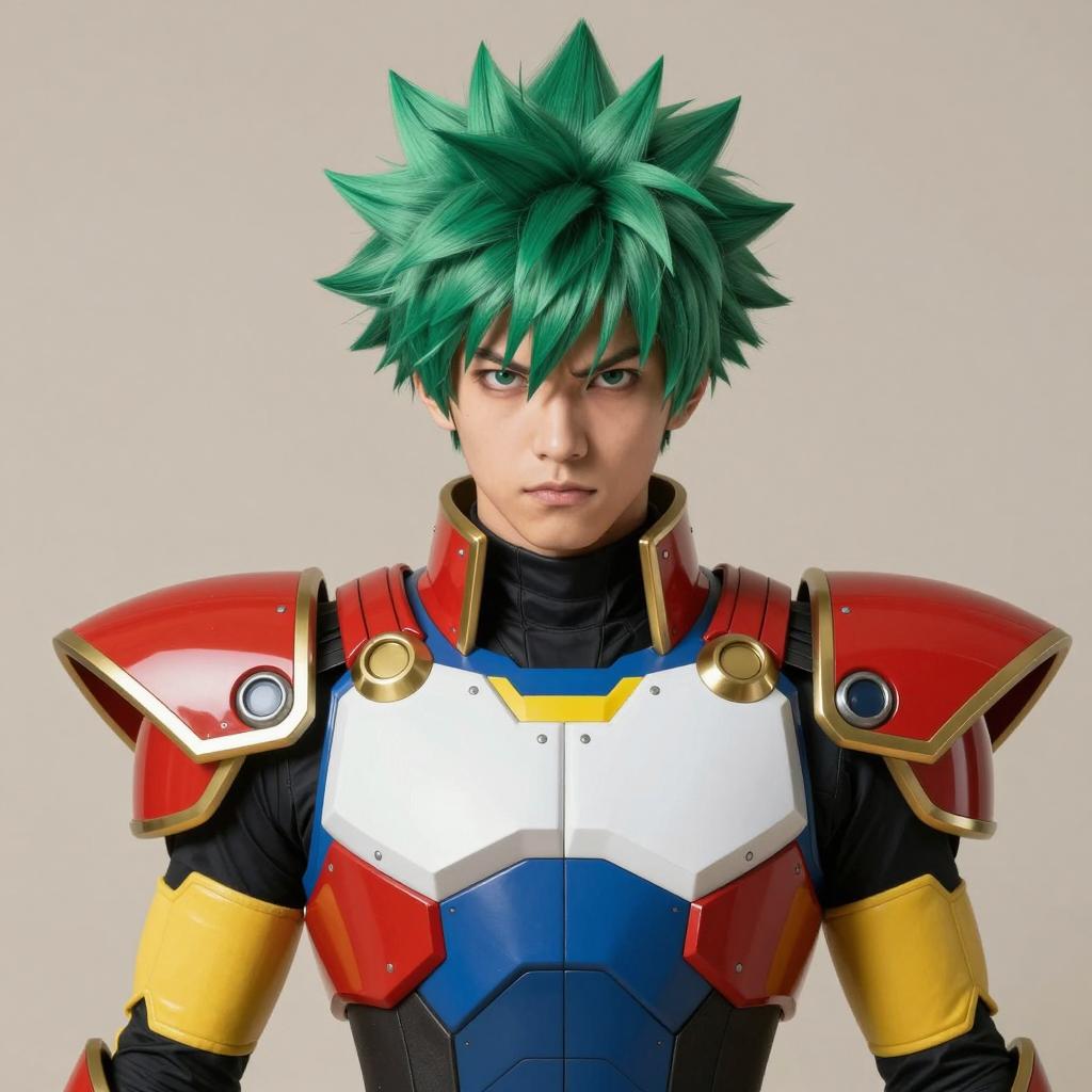 Photorealistic portrait of a young Asian man with vibrant multicolored hair in pink, green, and blue hues. He wears a distinct JoJo-inspired costume featuring a beige and green jacket with brass buttons, a white shirt accented by red buttons and a yellow and red collar, and a brown belt. The subject has a neutral facial expression and stands against a plain light gray background with studio lighting emphasizing the detailed textures.