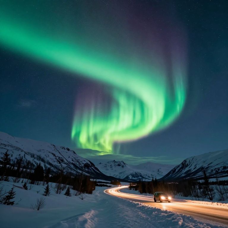 A stunning high-definition photograph captures the mesmerizing aurora borealis dancing across the night sky above distant snow-covered mountains, with a glowing road illuminated by vehicle lights winding through a serene winter landscape, showcasing the dramatic interplay of natural light and atmospheric beauty.