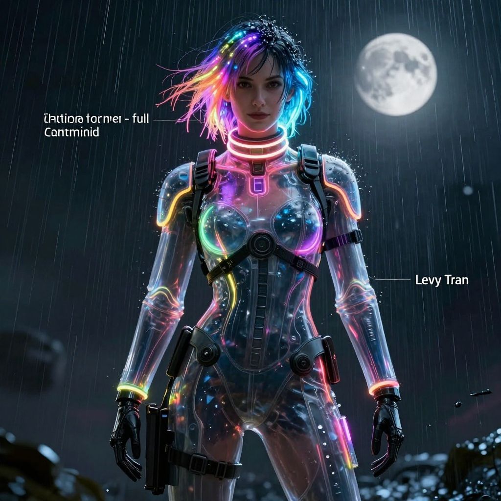 CGI image of a neon-lit, cybernetic woman with multicolored hair, standing in rain under a full moon. Labels: "