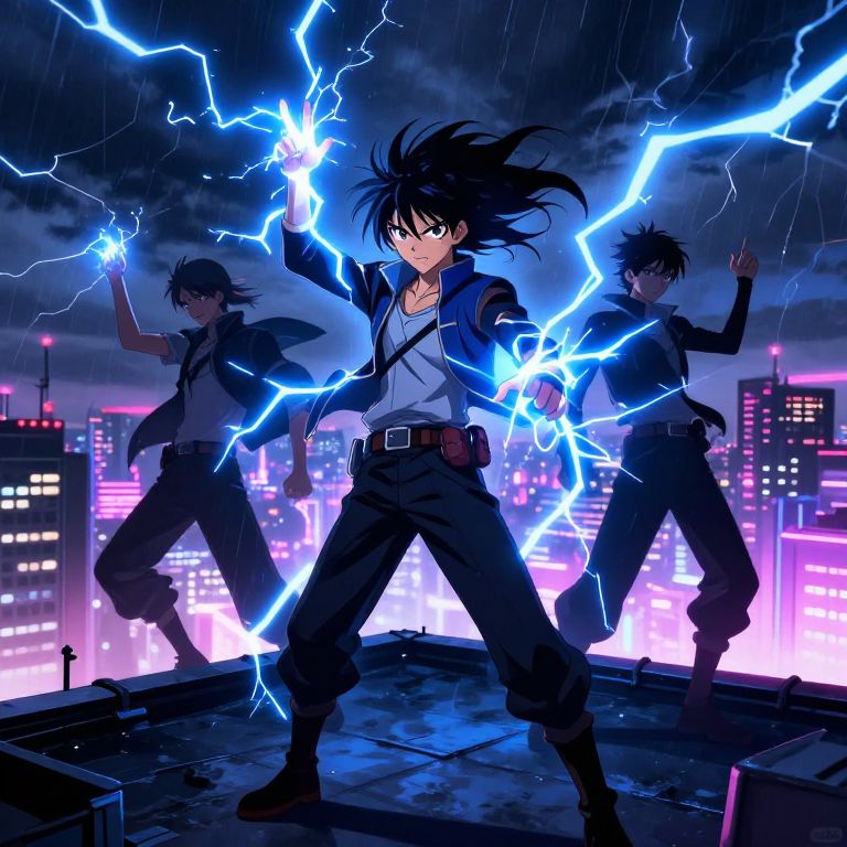 Anime characters with lightning powers standing on a rooftop during a thunderstorm, neon city lights below, electricity crackling from fingertips, glowing blue arcs connecting them, dynamic poses, fluid hair movement, highly detailed backgrounds, vibrant color palette.
