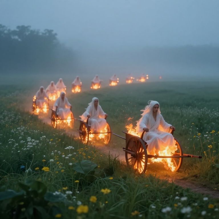 In a hazy meadow where whispers of the past mingle with the scent of wildflowers, ethereal figures cloaked in light guide fiery chariots through a dreamlike landscape, weaving stories of memory and transcendence amidst the ephemeral glow of fading embers.