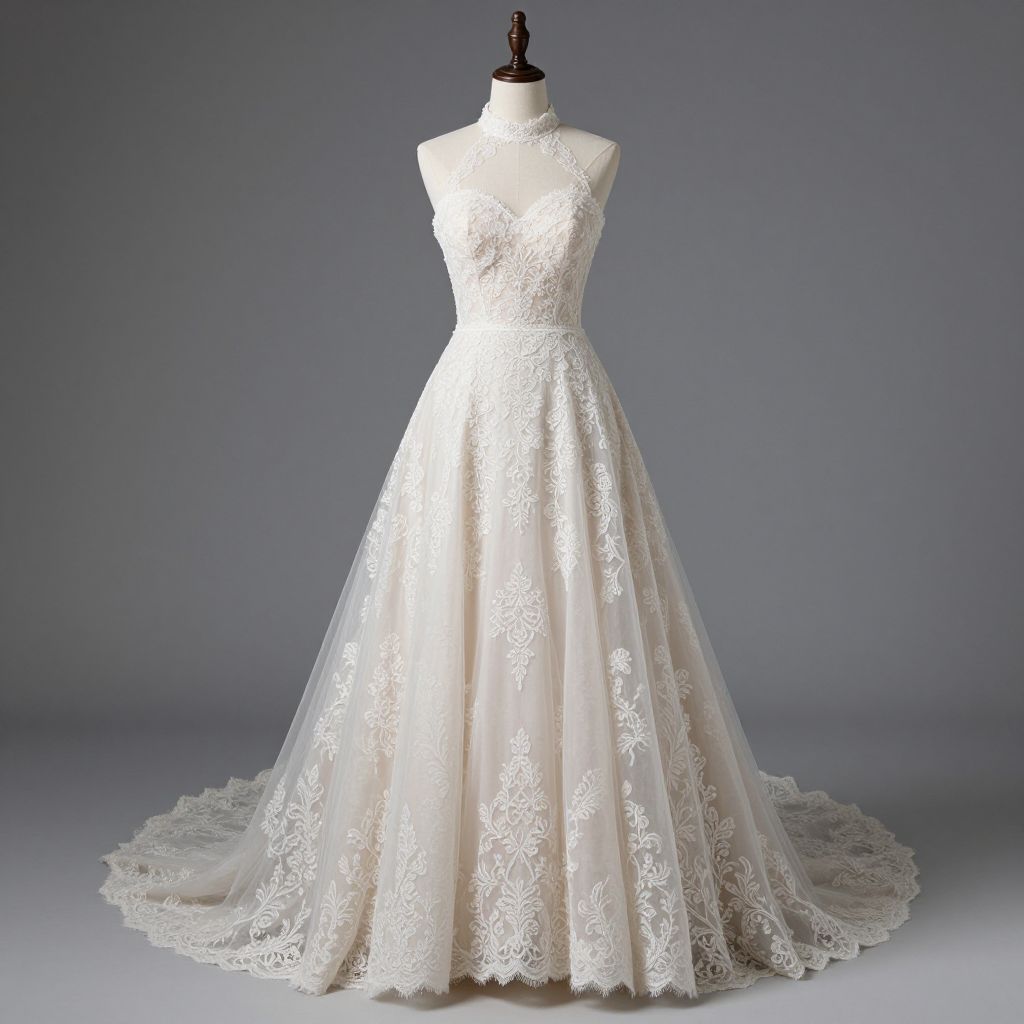 Photograph of a white, sleeveless wedding dress hanging on a white hanger against a bright white background. The dress features intricate, sparkling silver lace embellishments that form elegant, swirling patterns on the bodice and straps, adding a touch of glamour. The lace details are dense and shimmering, creating a contrast against the smooth, satin-like fabric of the dress. The overall style is elegant and modern, with a focus on delicate, sparkling details. The image is brightly lit, emphasizing the dress's intricate design and the hanger's minimalist design.