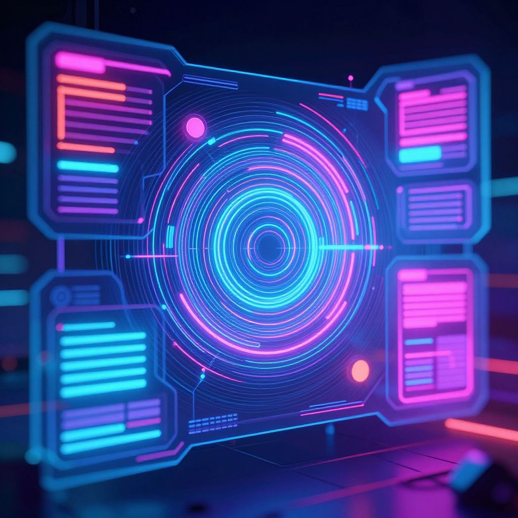 Neon-lit, digital interface displaying vibrant blue and pink concentric circles with glowing, holographic text panels on a dark background.