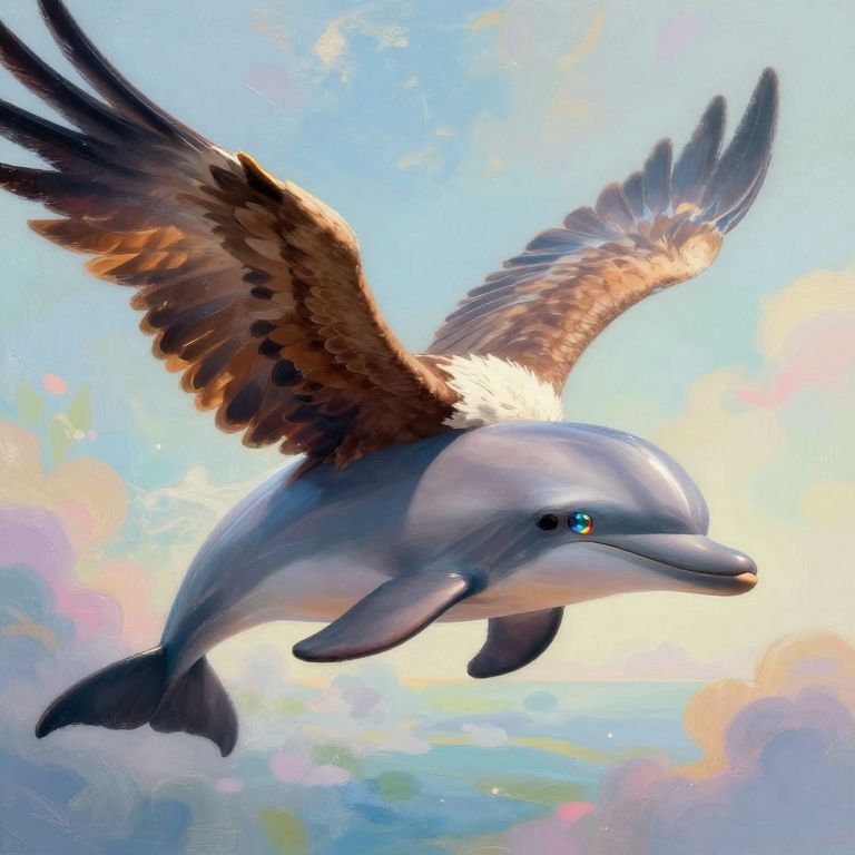 A fantastical creature with the majestic wings of an eagle seamlessly blending into the sleek body of a dolphin gracefully soars through a dreamlike landscape, evoking a sense of whimsy and enchantment. This imaginative being's eyes shimmer with curiosity and intelligence, reflecting the vibrant colors of its ethereal surroundings, where reality meets fantasy in a captivating display of artistry. The setting is painted with soft, whimsical brushstrokes that evoke wonder and lures viewers into this otherworldly realm, reminiscent of the enchanting illustrations that inspire such imaginative creations.