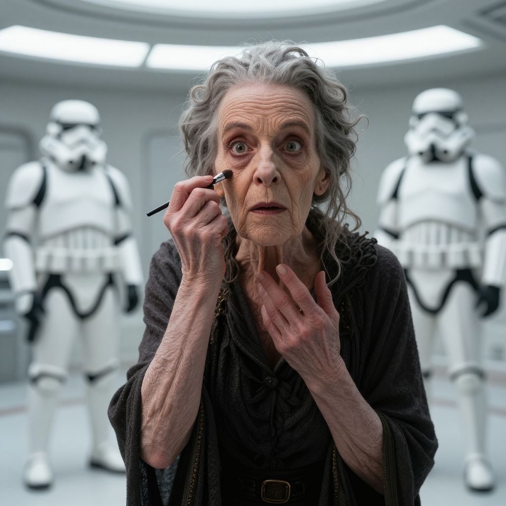 (full body cinematic still, feminine_anatomy, correct_eyes, correct_fingers, bokeh:1.2), (Curious expression, Raised eyebrows and wide eyes:1.3), An old wrinkled witch from the swamps applies makeup to herself in the minimalist interior of a Star Wars Imperial destroyer, (Imperial Stormtrooper with Down Syndrome:1.4), perfect body proportions, realistic skin details, ultrasharp, ultradetailed, perfect quality, masterpiece, intricated details, ultra clear, detailed skin perfectly detailed face, sharp face