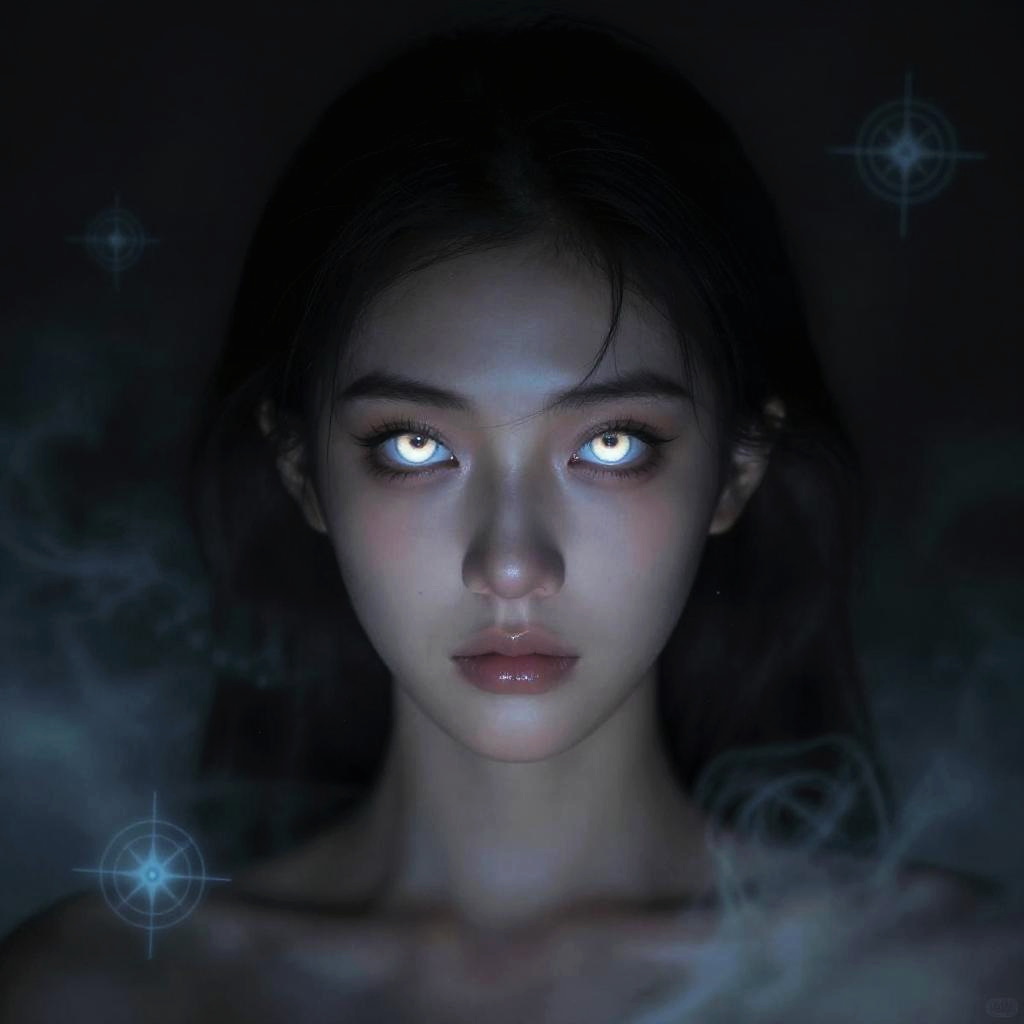 Surreal portrait of a figure with glowing catlike eyes staring intensely, surrounded by swirling mist and magical symbols, deep shadows, ethereal vibe