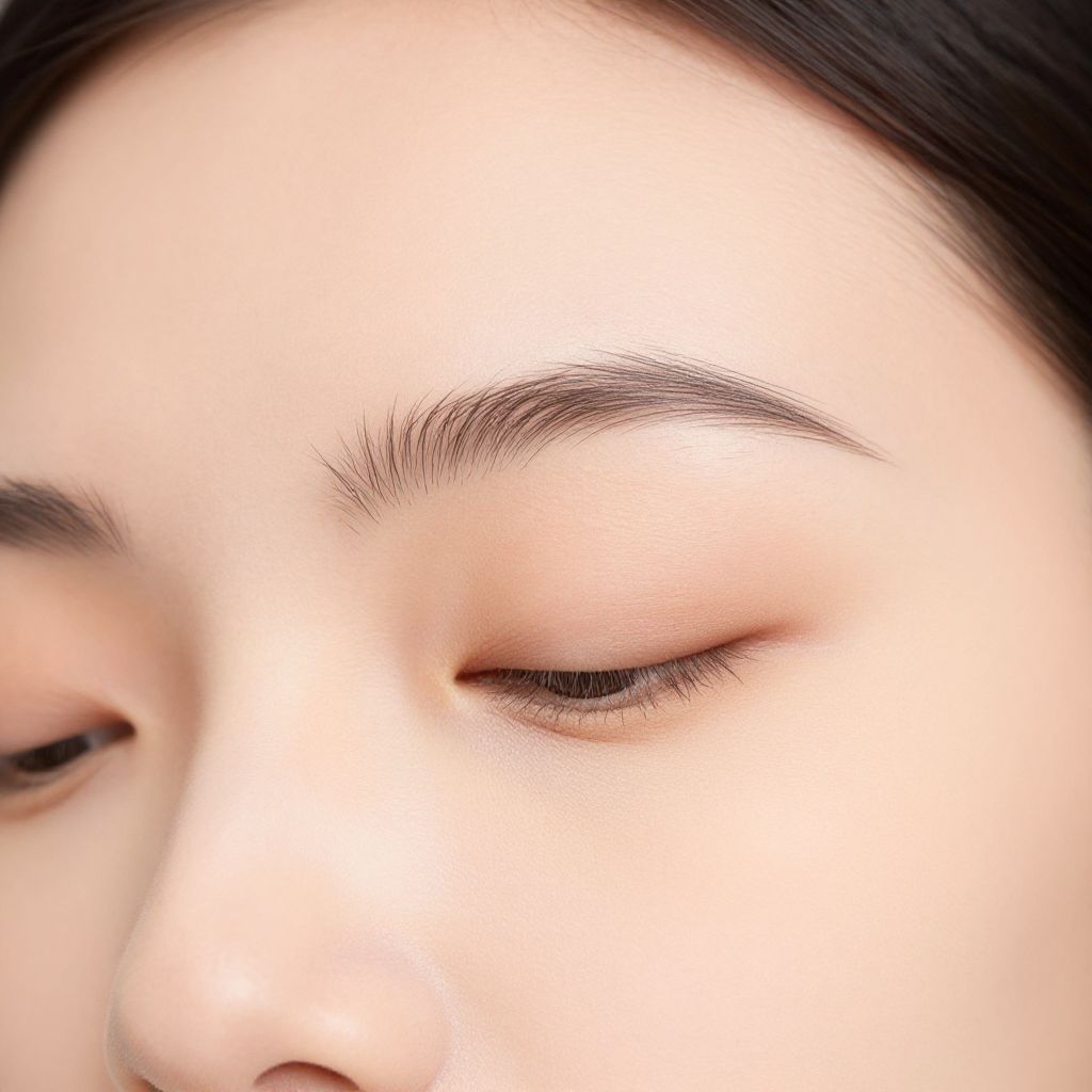 Close-up of wispy eyebrows on a fair-skinned model, detailed texture showcasing individual fine eyebrow strands, soft focus background, soft blush and neutral lip tint complementing the eyebrows, minimalist studio lighting, modern beauty photography style.