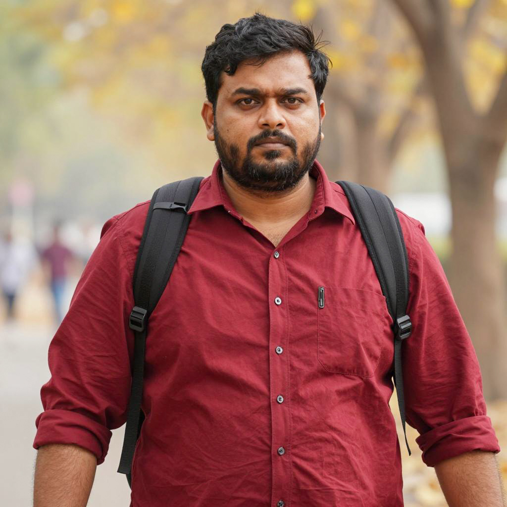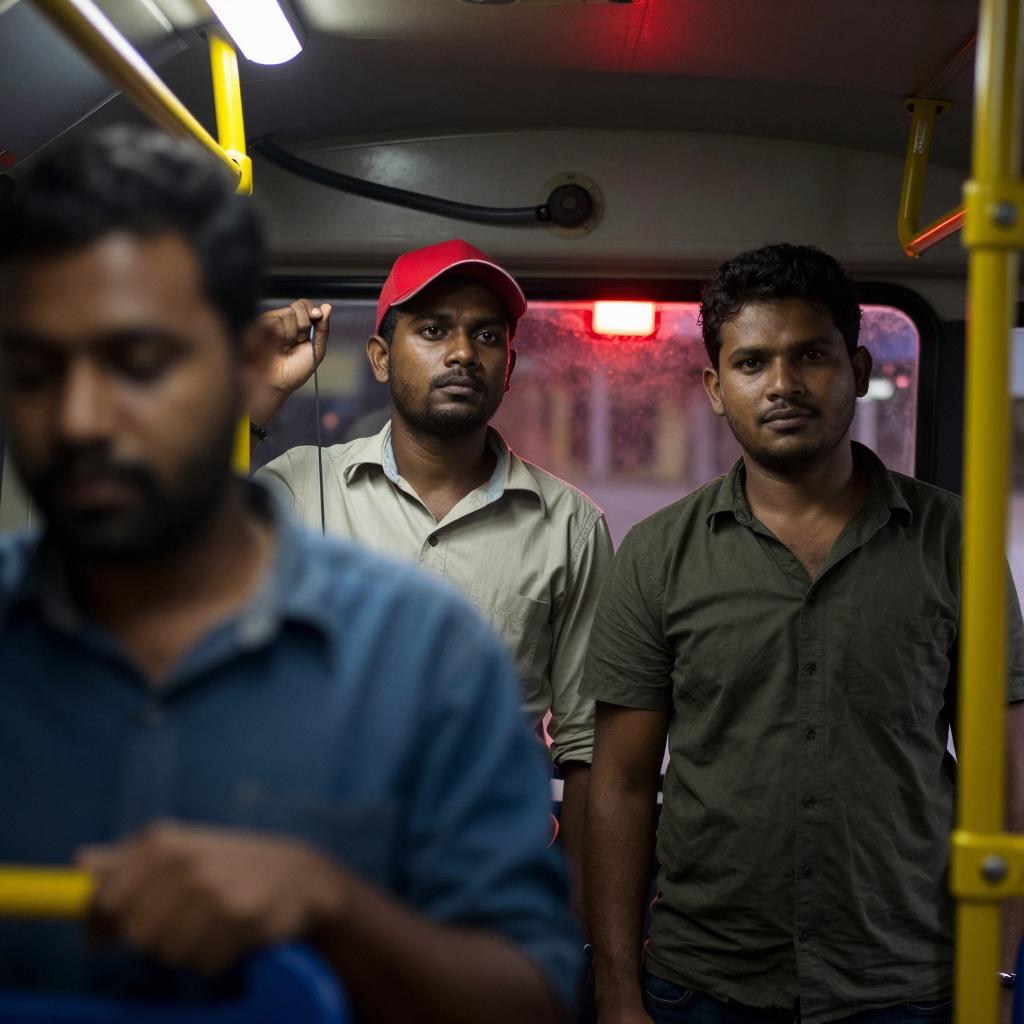 Three men inside a dimly lit bus. The foreground man is blurred, facing left. The middle man in a red cap and beige shirt stands to the left, gripping a cord. The man on the right, wearing a green shirt, looks forward. Red and yellow lights illuminate the background. The bus has metal structures and cables.