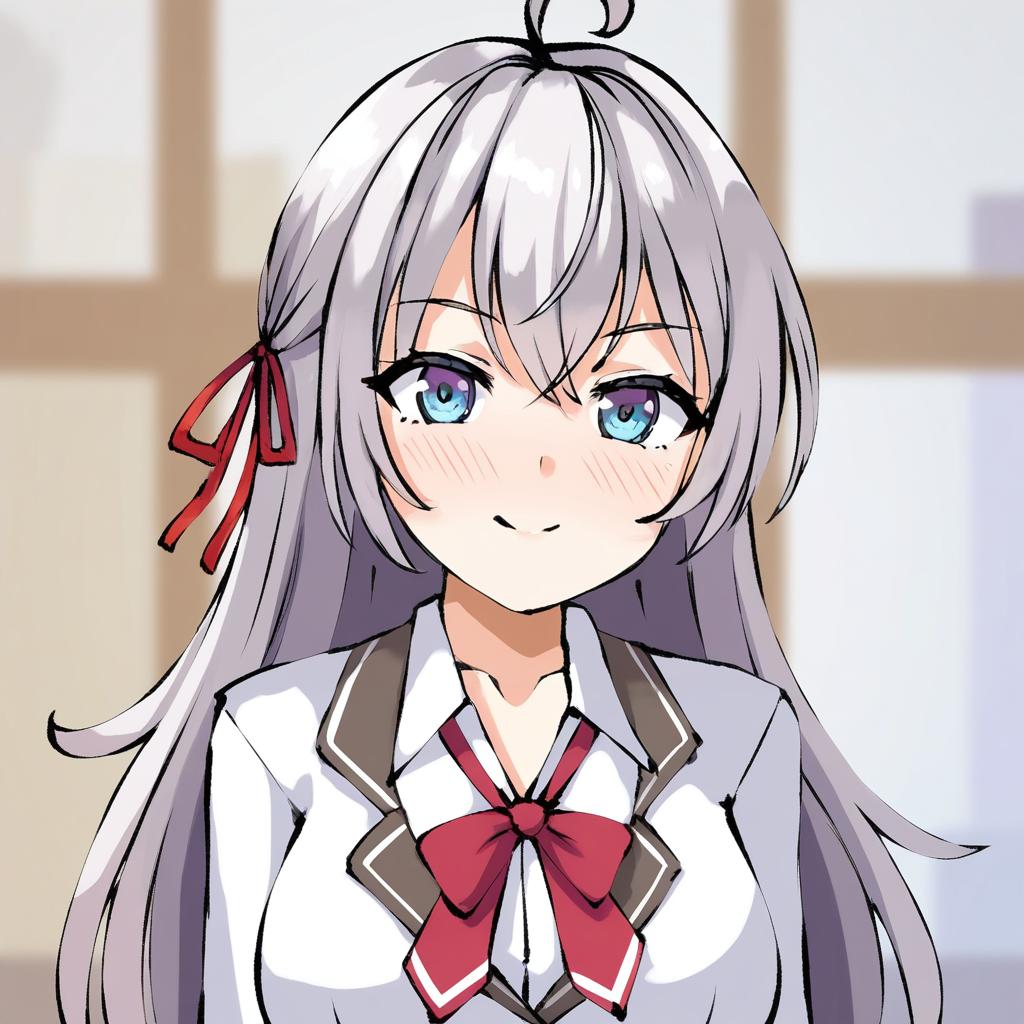 Alisa mikhailovna kujou, tokidoki bosotto roshia-go de dereru tonari no alya-san, 1girl, blue eyes, hair between eyes, long hair, white hair, grey hair, ahoge, hair ribbon, large breasts, school uniform, school uniform, red ribbon, long sleeves, by artist aposine, leet
