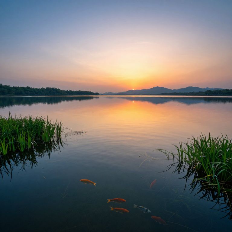 Photograph of serene lake at sunrise, with orange and yellow hues reflecting on calm water, surrounded by grass, mountains in distance, and colorful fish swimming