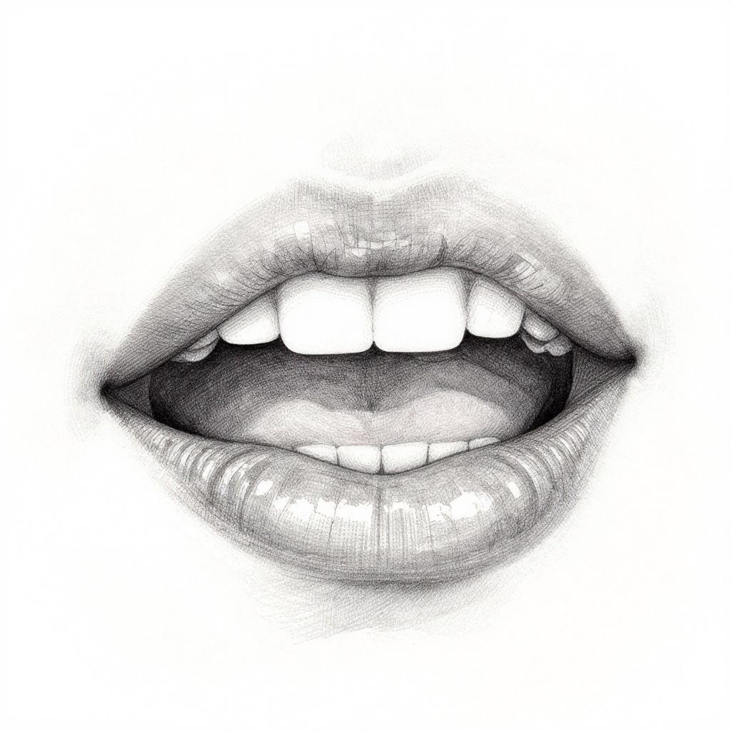 This is a detailed, black and white digital drawing of a partially open mouth with visible teeth. The lips are full and slightly parted, showcasing a realistic texture with fine shading that highlights the contours and natural folds. The teeth are white and slightly glistening, with a subtle reflection indicating moisture. The upper lip is slightly raised, revealing the tongue's underside at the bottom of the mouth. The background is entirely white, making the lips and teeth the focal point. The drawing style is hyper-realistic with a focus on texture and depth, using fine lines and gradients to create a lifelike appearance.