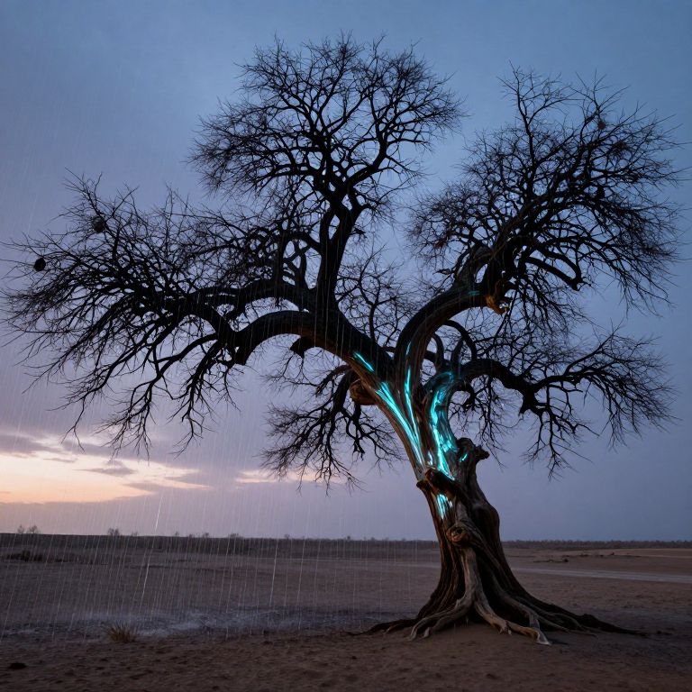 Majestic branches of an ancient, leafless tree stretch across a desolate landscape, its gnarled trunk glowing with ethereal bioluminescence as cascading streaks of light rain down upon a barren desert floor beneath a twilight sky.