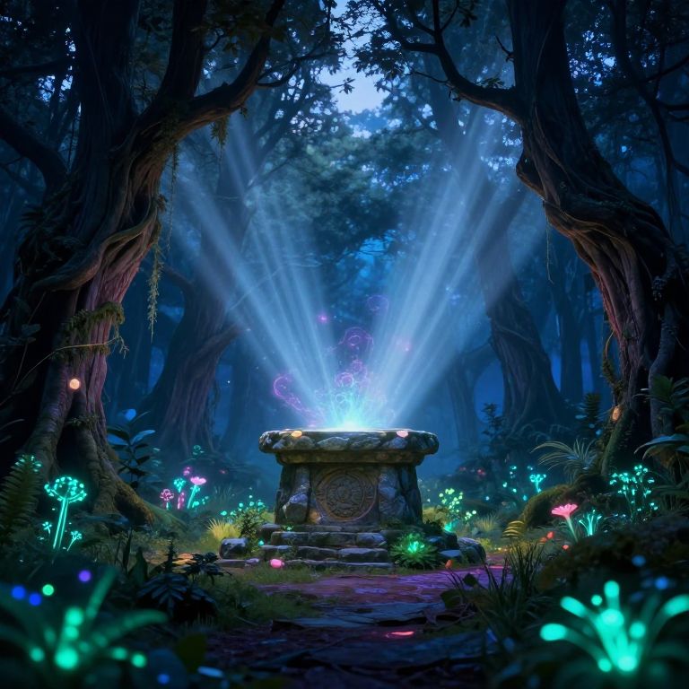 Mystical forest scene with glowing mushrooms, ethereal blue beams emanating from a stone altar, surrounded by tall trees and dense foliage.