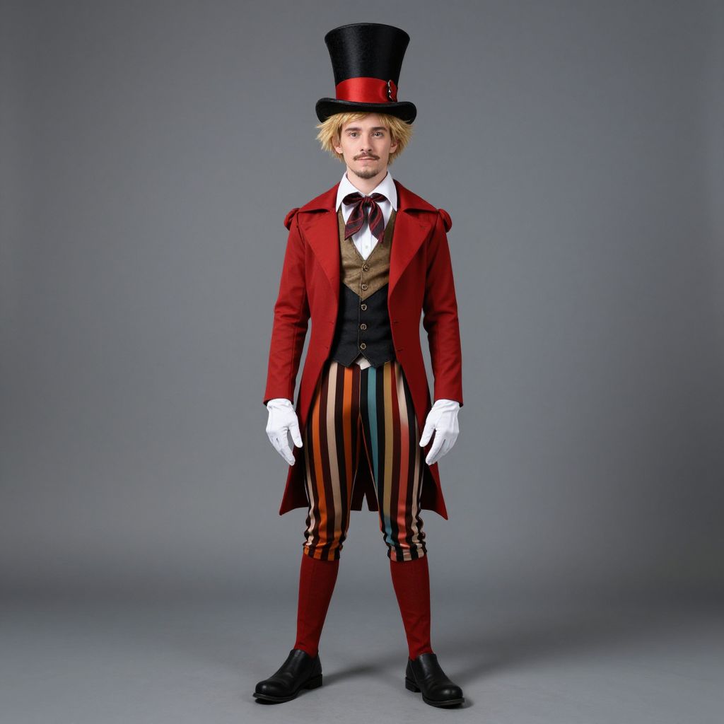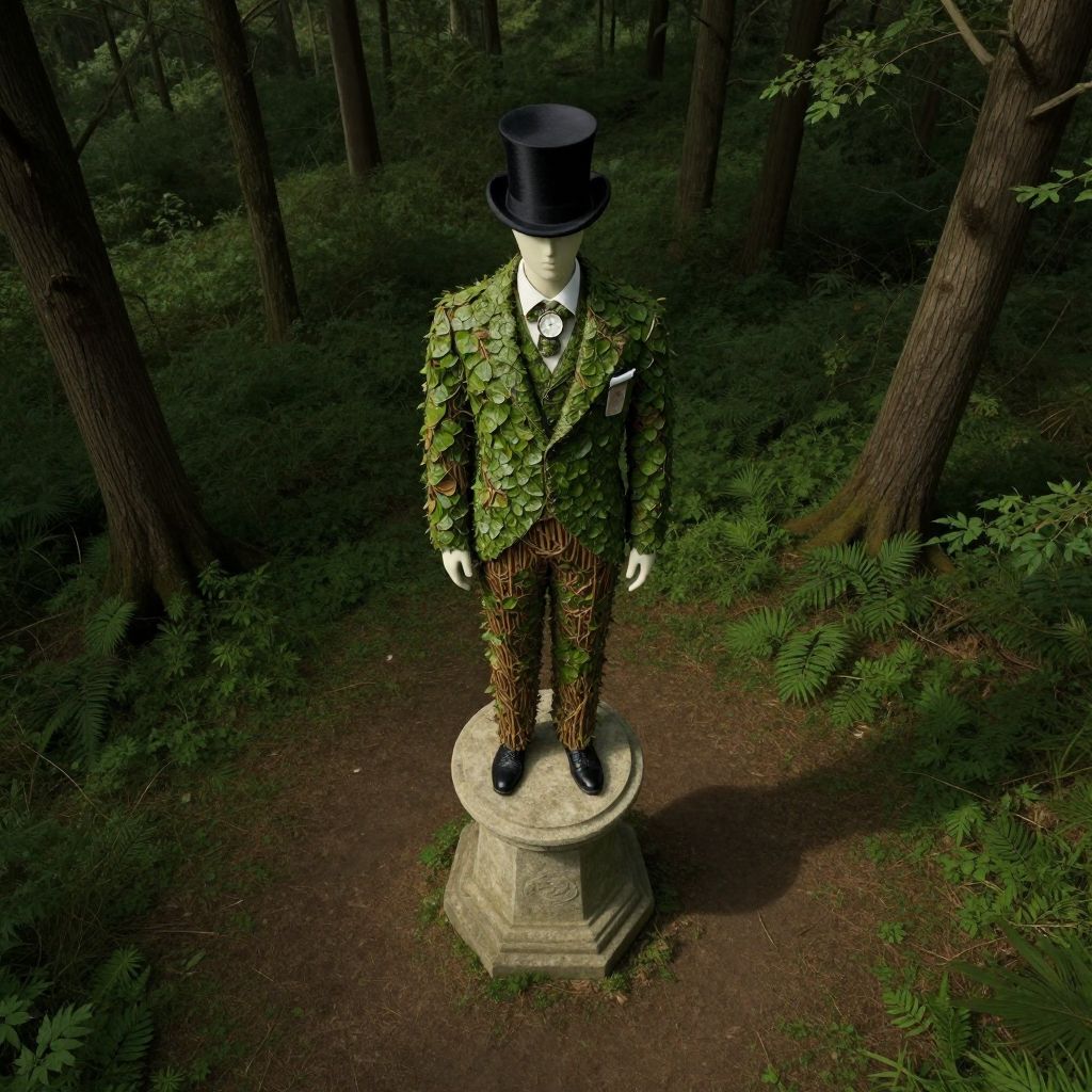 Craft an image embodying the dreamlike surrealism reminiscent of Magritte's distinctive style, featuring a mannequin perched atop a stately stone pedestal within a shadowy forest glade. The mannequin is adorned in an elaborate suit mirroring that of a Victorian gentleman, complete with a top hat and a watch defying gravity. Crafted from leaves and twigs, the suit seamlessly integrates into its natural surroundings. Capture this surreal scene through an aerial 'bug's-eye view' perspective as one approaches from above, emphasizing the mannequin's unnerving stillness against the verdant forest. This enigmatic composition invites viewers to explore Magritte's captivating realm where reality intertwines with fantasy, sparking curiosity and wonder.