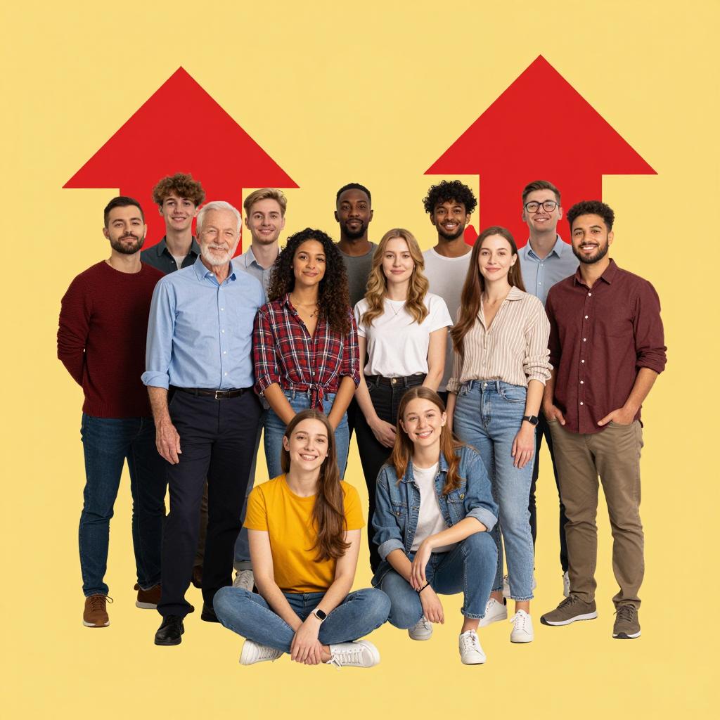 A diverse group of 14 people of various ages and ethnicities posing together against a bright yellow backdrop. Two large red arrows are prominently displayed behind the group, pointing upwards. The individuals are dressed in a mix of casual and formal clothing, with some standing and others sitting or kneeling. The group exhibits neutral to smiling expressions, symbolizing unity and progress.
