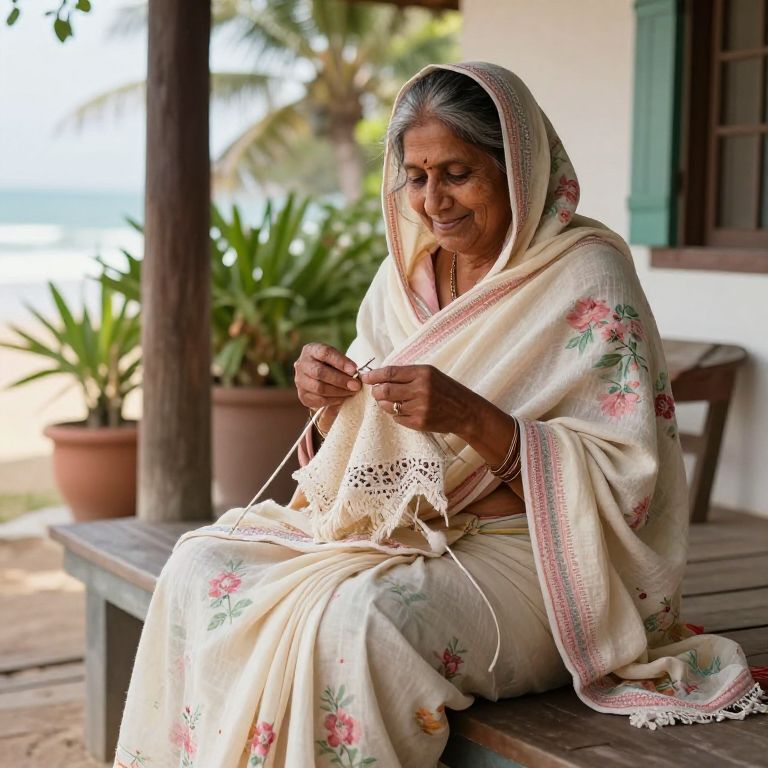 Saree aunty sitting on a wooden veranda, wrapped in a pastel-colored cotton saree with floral patterns, knitting a shawl, soft smile, natural daylight, vintage setting with potted plants, warm and cozy coastal village atmosphere, delicate embroidery on saree, peaceful moment.