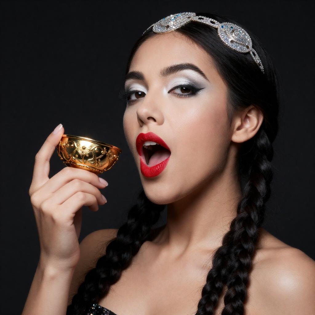 Photograph of a woman with black braided hair, wearing a glittery headpiece and bold red lipstick. She has white eyeshadow and black eyeliner, looking up with mouth open. She holds a golden, ornate object in her right hand. Black background.