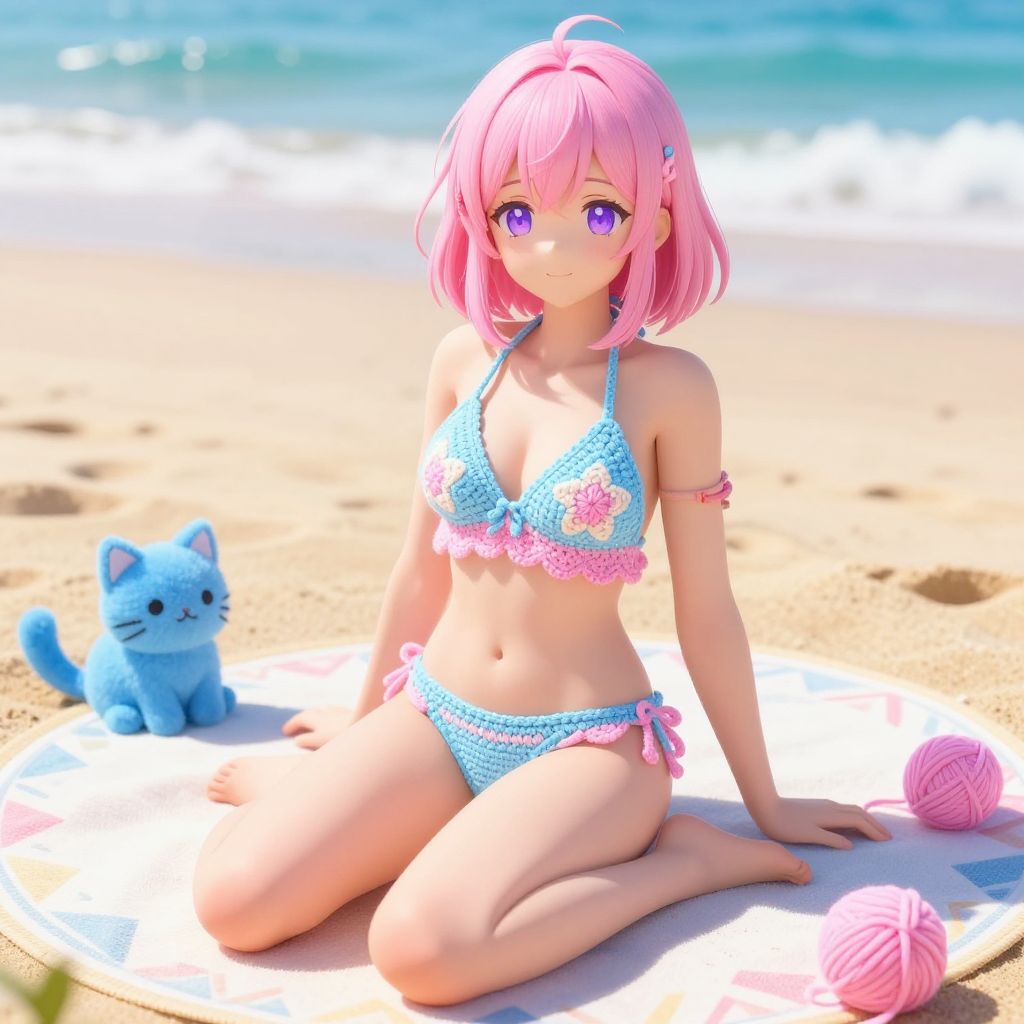 Digital artwork of an anime-style girl with pink hair and purple eyes wearing a pastel blue and pink retro crochet bikini with scalloped edges and halter neck design. She is sitting on a round beach blanket with geometric patterns at a sunny beach with sun-kissed sand and waves in the background. The swimwear has a plush feel, made with durable acrylic yarn. Nearby is a plush blue cat and a pink ball of yarn.