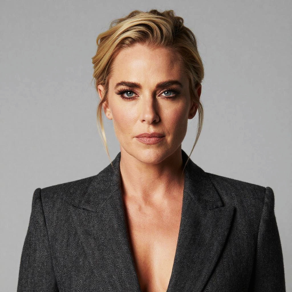 Photograph of a blonde woman with light skin and blue eyes, wearing a black, textured, V-neck blazer. Her hair is styled in a loose, slightly messy updo with a few strands falling across her face. She has well-defined eyebrows, subtle makeup, and nude lipstick. The background is a solid, light gray color, which contrasts with her dark blazer. She is looking directly at the camera with a calm, confident expression. The image is well-lit, highlighting her facial features and the texture of her blazer.