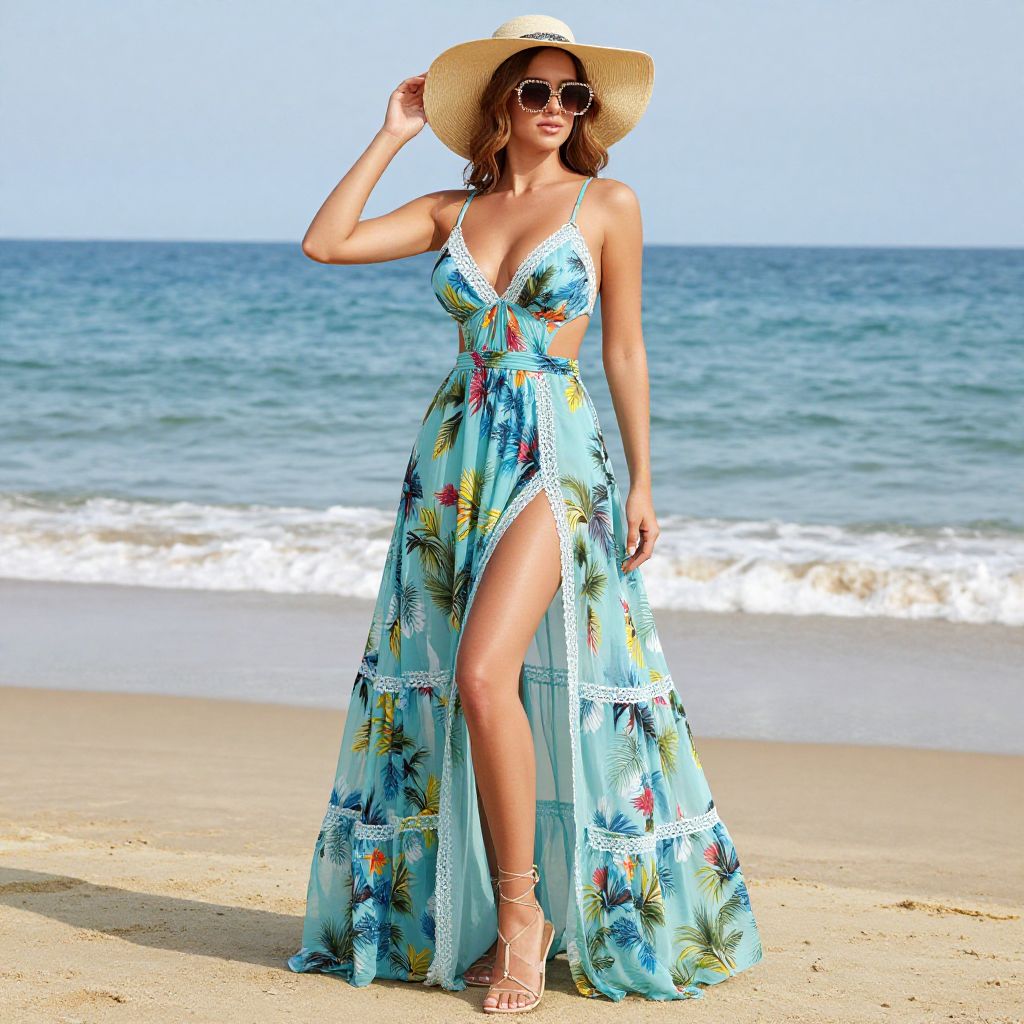 Model showcasing a Hyiluer floral print beach maxi dress with a deep V-neck and side slit, standing confidently on a sandy beach with the ocean and clear sky in the background.