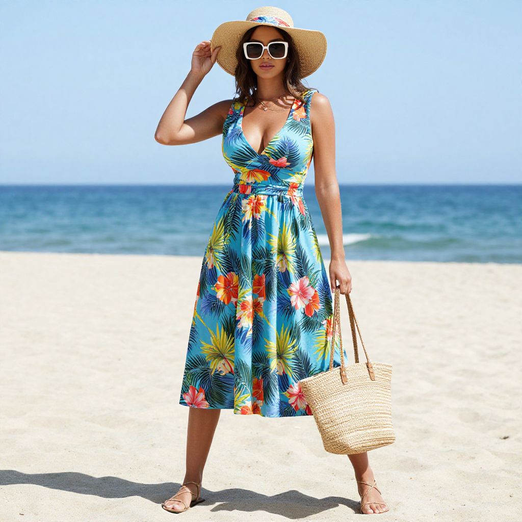 Photograph of a young woman standing on a sunny beach. She has medium-length, wavy black hair and a light brown skin tone. She wears a sleeveless, deep V-neck, blue maxi dress with a vibrant floral pattern featuring large yellow, red, and white flowers. The dress has a high slit on her left side, revealing her leg. She stands barefoot on the golden sand, with her left leg slightly forward and her right leg back. The ocean with small waves and a clear blue sky are in the background. The image has bright, vivid colors and a sharp focus.