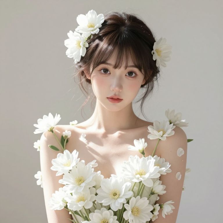 A hyper-realistic portrait of a young East Asian woman with delicate features and charming eyes, adorned with multiple white flowers emerging from her shoulders and hair. The bright natural lighting highlights the soft skin texture and intricate petals, set against a light neutral background to emphasize the ethereal and surreal beauty.