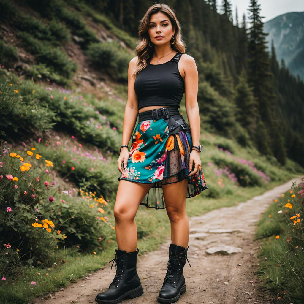 Photo of a Rounded Stomach woman, Side Swept slutty outfit, cami top with a colorful floral pattern and mesh panel skirt with thigh-high hiking boots, soft focus