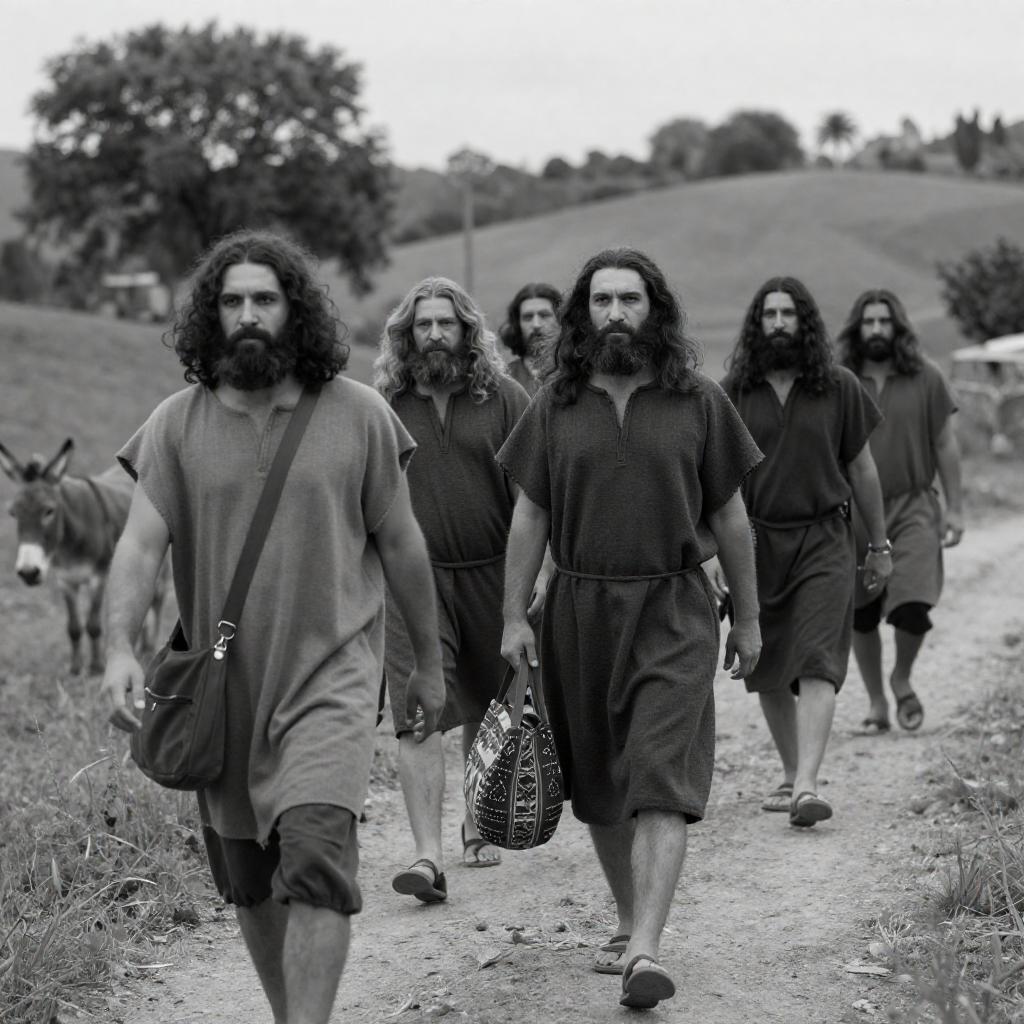 Photograph of a movie scene. Group of men in rugged, worn clothing, walking through a muddy, sunlit forest. Leading man with long hair, brown robe, and drum. Other men with varying expressions, holding spears. Sunlight filters through trees. Yellow-orange glow in background. Multiple men in background, some partially obscured. Muddy ground, scattered debris. Intense expressions on some men.