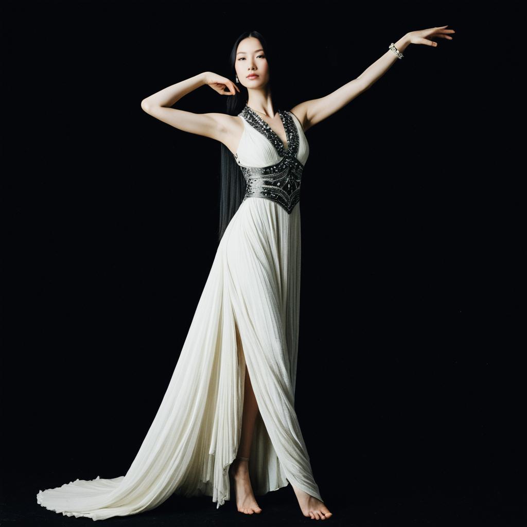 Full-length portrait of a tall Asian woman with porcelain complexion and straight jet-black hair wearing a flowing black pleated dress. The dress features intricate garment details and a high slit. She accessorizes with delicate luminous jewelry including a statement necklace, a beaded belt, and matching bracelet. The woman stands gracefully against a solid black background, holding the sides of her dress with an elegant posture and serene expression.