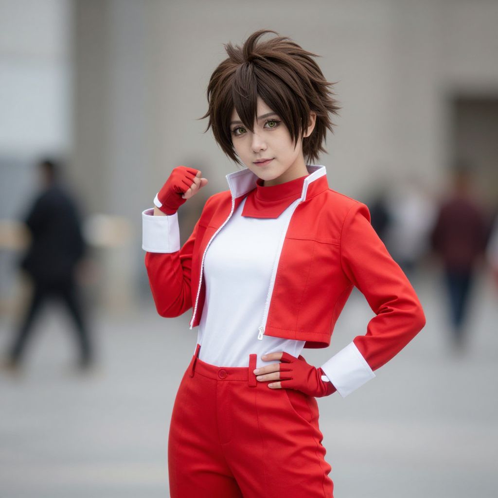 Photograph of an anime-style cosplayer with short, tousled black hair and large brown eyes. They wear a bright red, fitted jacket with white cuffs, a white shirt, and matching red pants. Red gloves complete the outfit. The cosplayer stands confidently with one hand on their hip and the other raised in a fist. The background is blurred, featuring gray building walls and indistinct people. The overall style is vibrant and sharp, with a focus on the cosplayer's detailed costume and expressive pose. The image has a slightly glossy, digital effect.