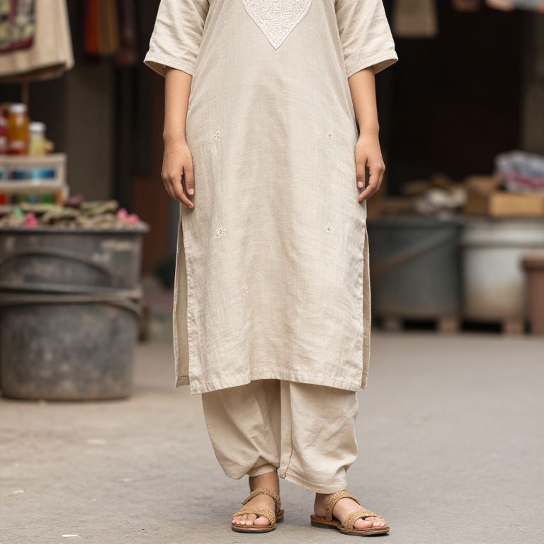 A modern kurti prompt featuring a lightweight cotton kurti with handcrafted embroidery on a neutral beige background, styled casually with a plain dhoti and woven sandals. Natural light, urban market setting, warm tones, realistic fabric details, Dall-E style.