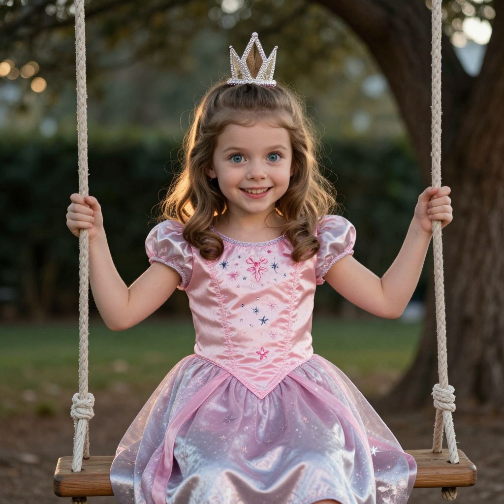 A realistic, slightly cinematic shot of a young girl in a Princess Nella costume, wearing a soft pink and silver dress with tiny embroidered stars and a miniature crown; she has large, expressive blue eyes and a cheerful grin, sitting on a wooden swing in a tree-lined backyard during golden hour