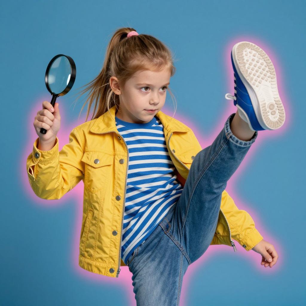 Young girl with light brown hair in a ponytail, wearing a yellow jacket, blue striped shirt, and blue jeans, holds a magnifying glass in her right hand. She kicks her left leg up, revealing a blue sneaker with white soles. Background is solid blue with a pink neon glow around her. She has a focused expression.